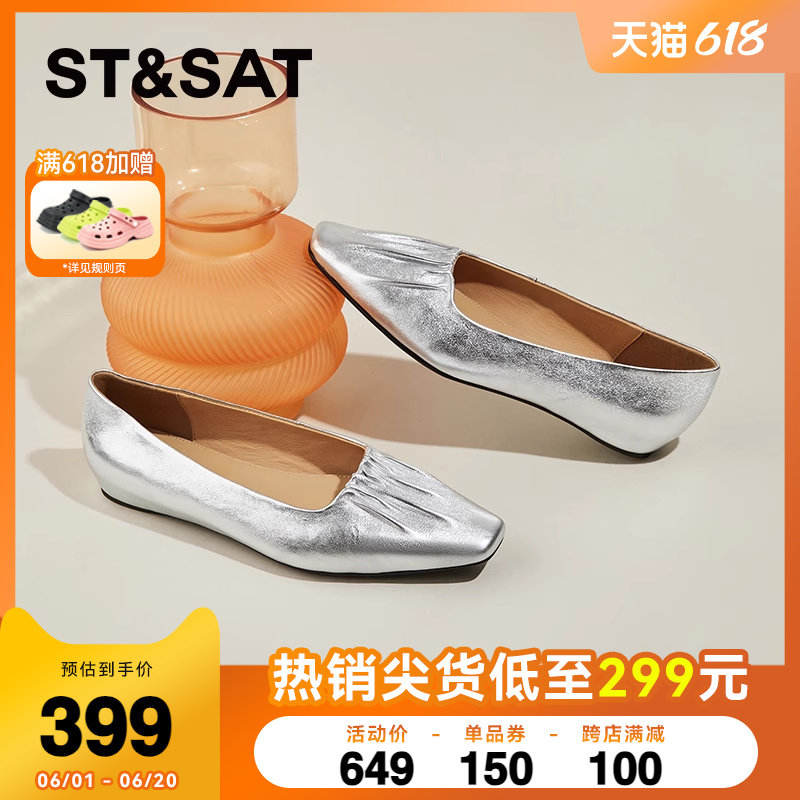 星期六银色单鞋女2024新款褶皱法式气质芭蕾舞真皮百搭平底奶奶鞋