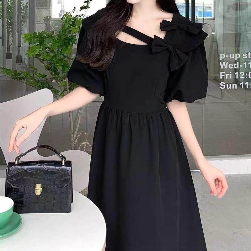 HZA法式赫风胖泡泡袖连衣裙夏女季大码妹妹收腰显瘦黑色减龄长本