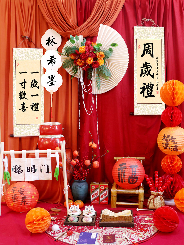 首页 > 未分类 > 宝宝一周岁红布生日布置国风中式抓周宴虎抓阄道具套餐装饰背景