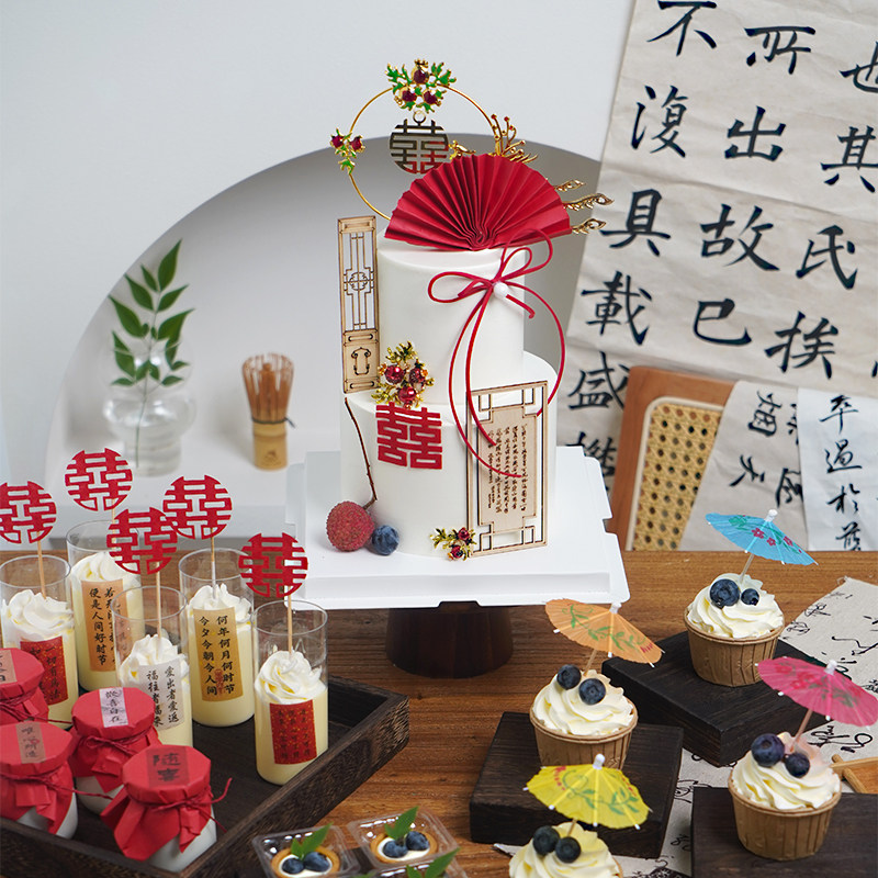 中式订婚宴蛋糕装饰摆件喜字屏风雨伞婚礼结婚甜品台婚庆烘焙插件