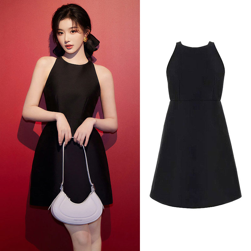 孔雪儿同款黑色挂脖式背心连衣裙女赫本风气质收腰显瘦无袖小黑裙