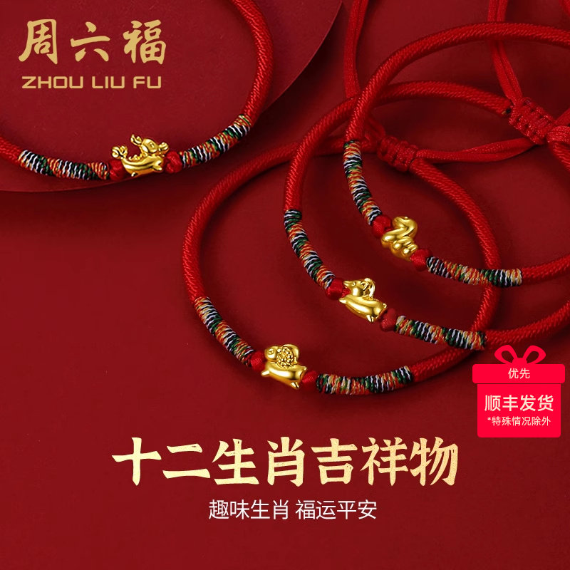 周六福黄金手链女定价5d硬金十二生肖宝宝足金本命年红绳生肖礼物