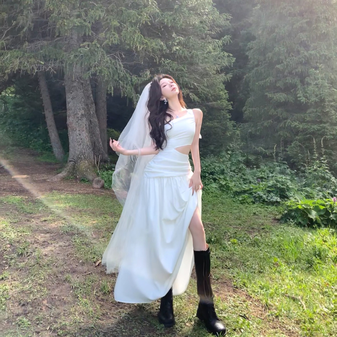 小雨姐姐新款【纯恋裙】小众设计感无袖单肩镂空收腰修身连衣裙女