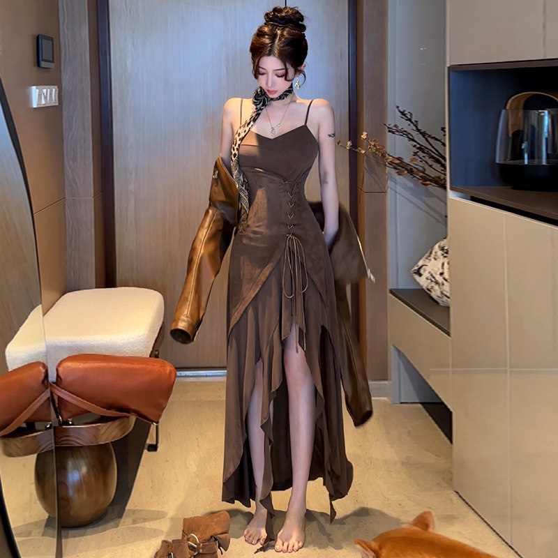 小雨姐姐新款【栗咖裙】复古设计感不规则绑带荷叶边修身显瘦吊带