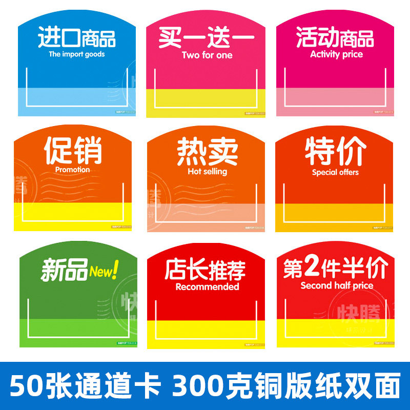 50张铜版纸通道卡买一送一特价促销热卖插卡进口商品超市标价标签