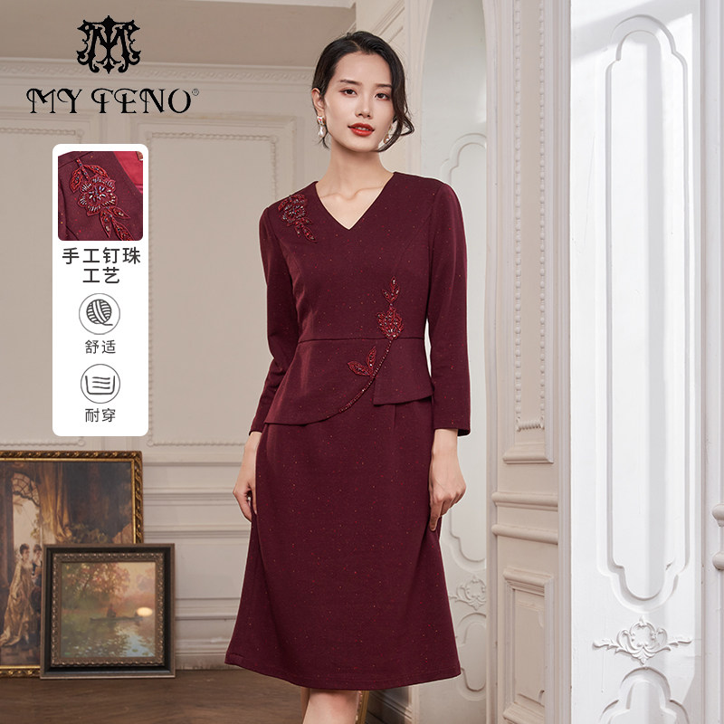马天奴新款红色V领钉珠婚宴连衣裙闪葱长裙喜婆婆礼裙
