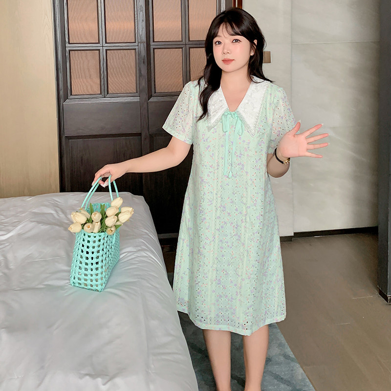 大码2024姐妹款减龄茶粒籽法式茶歇镂空小A摆方领花边显瘦连衣裙