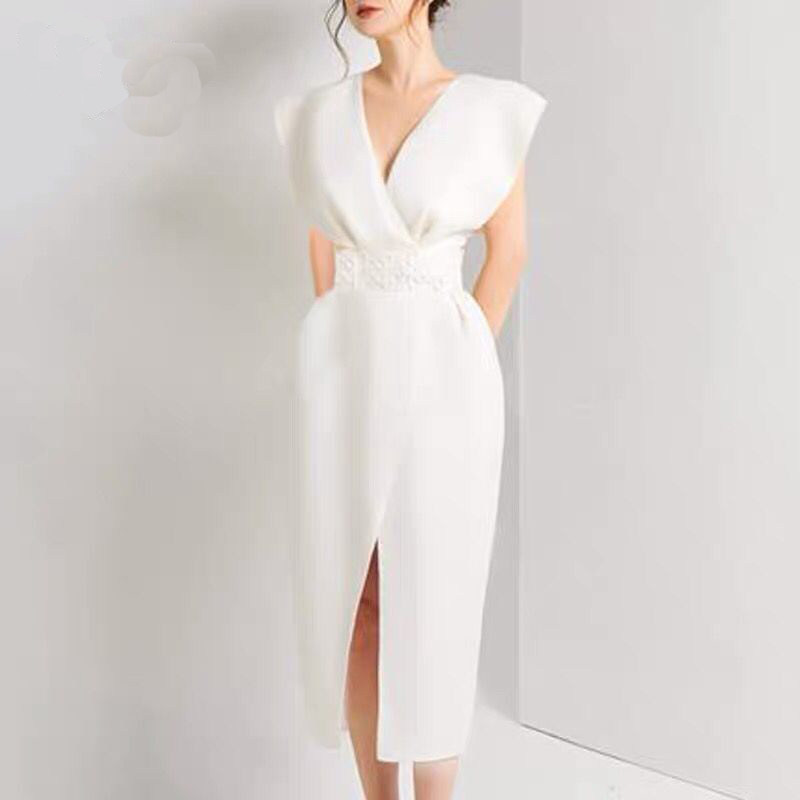 法式性感V领白色礼服轻奢小众高端级气质名媛晚宴年会收腰连衣裙