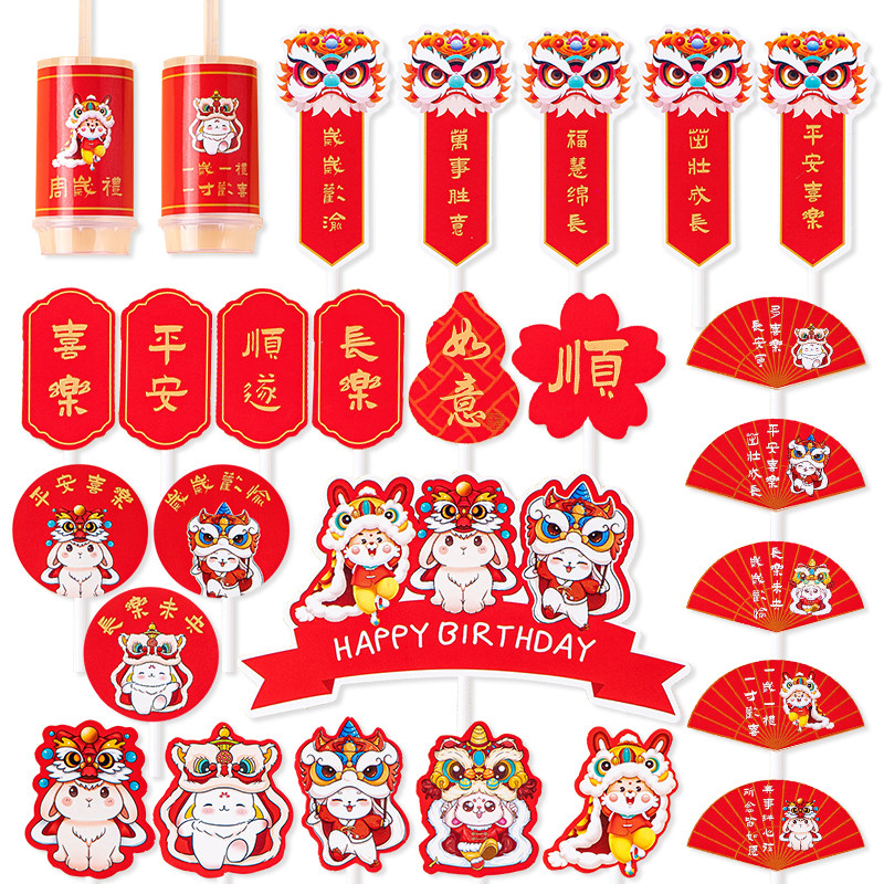 中式国潮儿童周岁布置甜品台蛋糕装饰舞狮醒狮兔宝宝生日装扮插牌