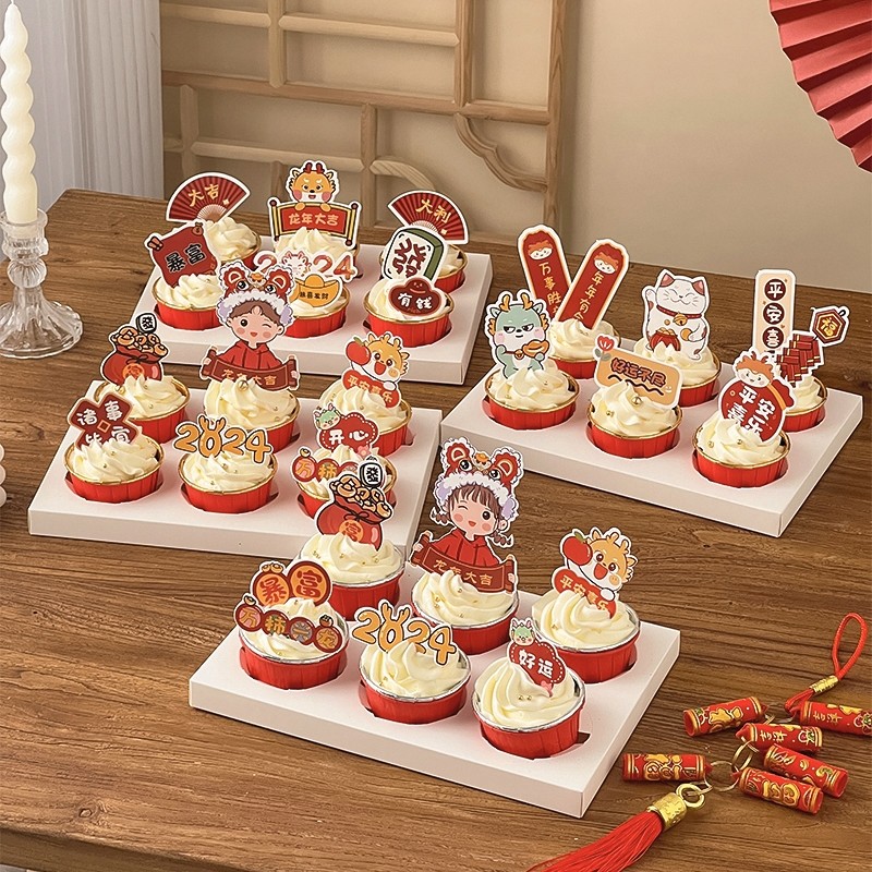 新款2024纸杯蛋糕装饰品新年快乐元旦跨年龙年大吉节日甜品台插件