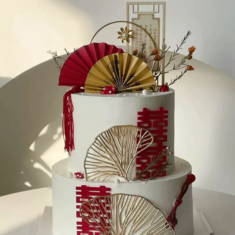 新中式结婚蛋糕摆件木质屏风文字结婚订婚金色银杏叶蛋糕装饰插件