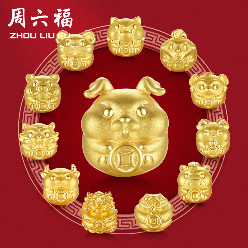 周六福黄金转运珠定价女抱财3d硬金手串本命年十二生肖红绳礼物