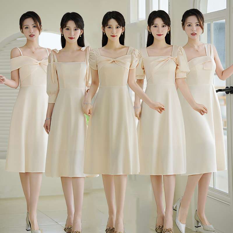 香槟色缎面伴娘服2024新款小众高级感姐妹团礼服裙女平时可穿春夏