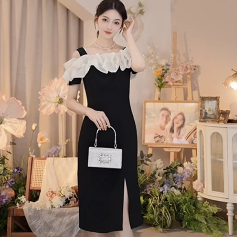 一字肩法式连衣裙女网纱性感荷叶边拼接小黑裙气质收腰显瘦鱼尾裙