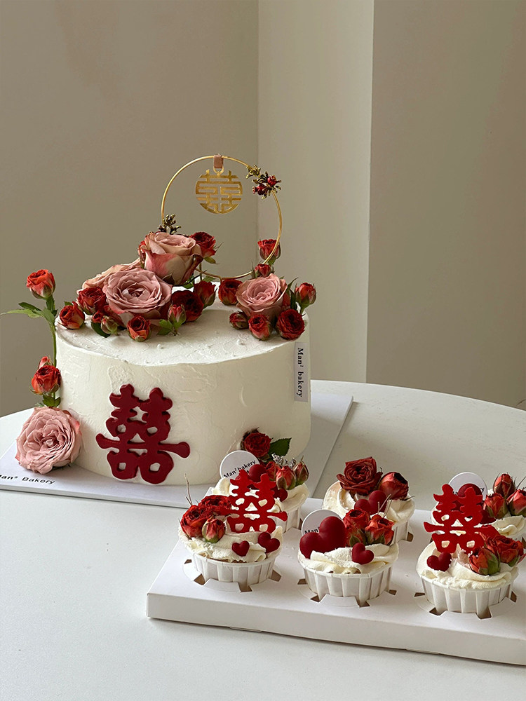 中式订婚宴纸杯蛋糕装饰摆件铁艺圆形囍石榴花插件结婚喜字甜品台