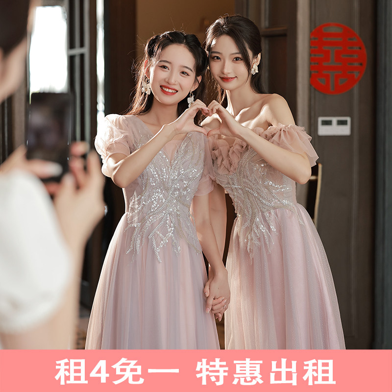 出租赁粉色伴娘服2024新款夏季长款显瘦姐妹团礼服裙表演出合唱服