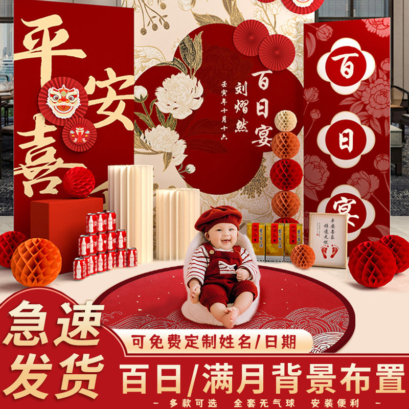 新中式宝宝满月百天百日宴场景布置装饰男女孩网红kt板背景墙定制