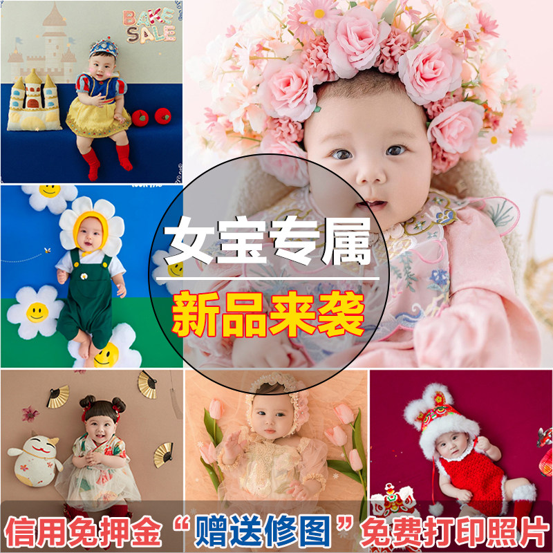 百天女宝宝服装出租赁儿童影楼摄影簪花主题套装满月百日拍照道具